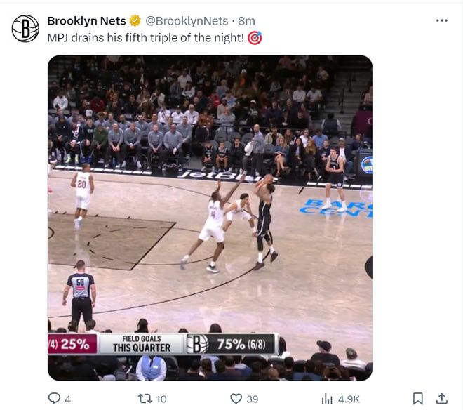 小波特在篮网的首秀实际上也发挥不佳,25分钟,15中5+三分7中2拿到12分5助攻4篮板,不过他第二场就爆发了。