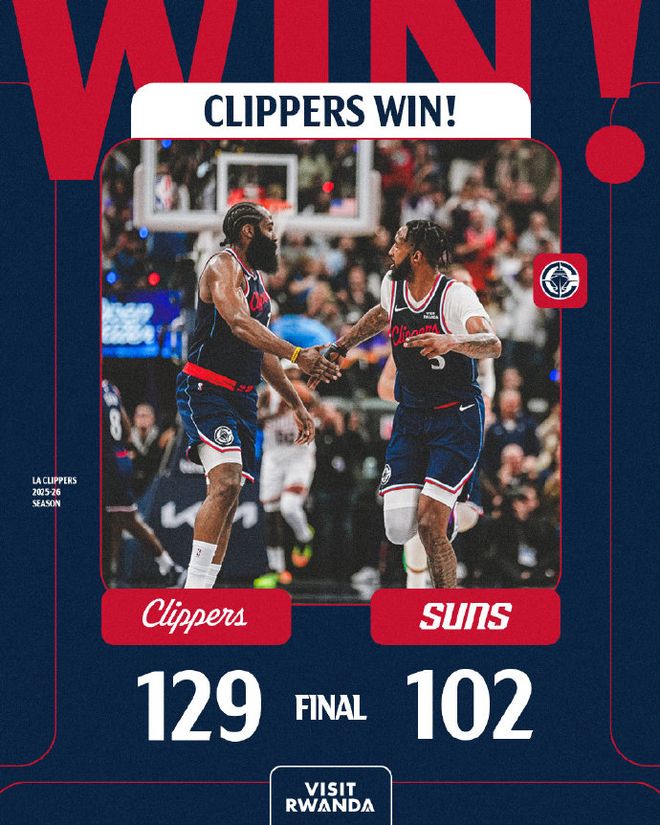 快船:哈登30分7板7助、莱昂纳德27分5板5助、琼斯17分4板2助、邓恩14分2板1助3断、科林斯10分6板2助2断、祖巴茨8分5板4助。
