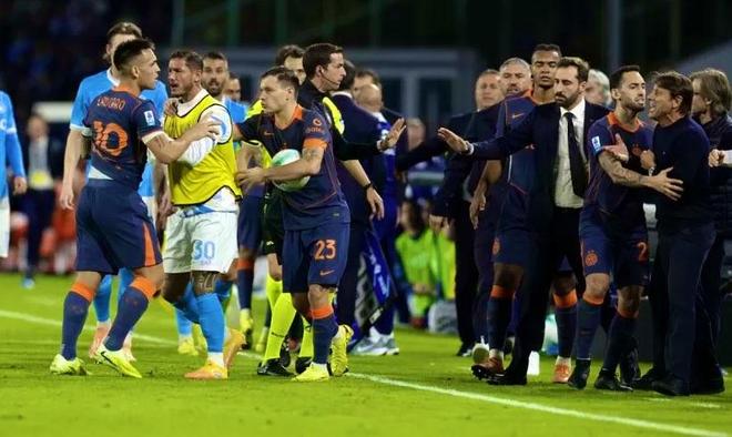 从比赛回放来看,孔蒂先是与邓弗里斯发生了言语冲突。随后劳塔罗冲了上来与孔蒂以及那不勒斯教练组对喷。