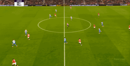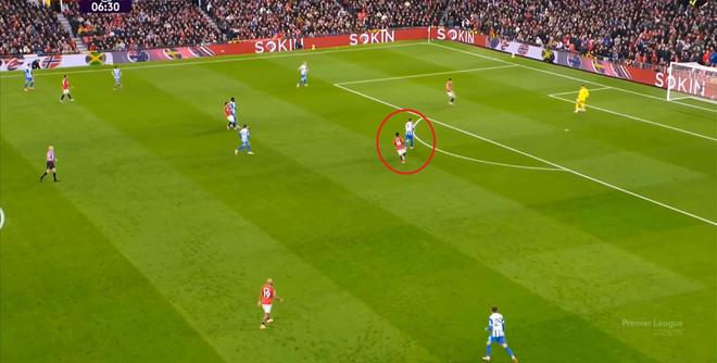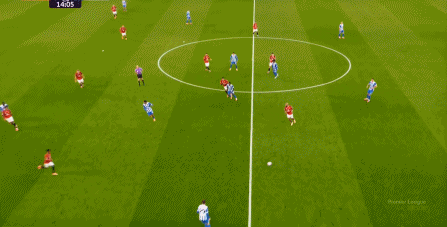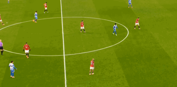 所以在开局阶段,在曼联还没有进球之前,布莱顿就已经可以通过曼联在某个局部的人盯人失败,从而获得非常好的机会: